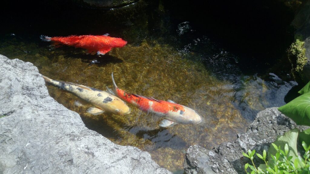 と自分に言い聞かせて、ゆっくり入っていると、目の前の水面を赤い鯉が優雅に泳いでいるではありませんか!