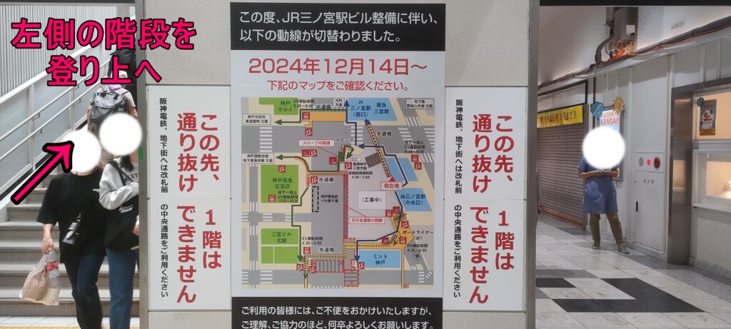 三宮駅前が工事中の為、左側の階段を登りぐるっと迂回しなければなりません。