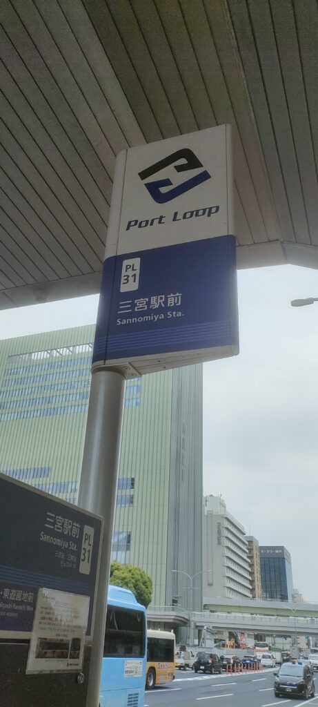 - 目印: 三宮交差点の東側すぐの歩道橋下にあり、「PortLoop」と記載された青と白のバス停の標柱が目印です。