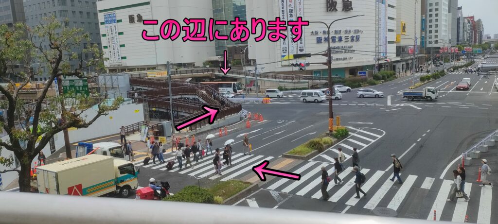 横断歩道を渡り、歩道橋を登り、阪急百貨店前左側の階段から下へ降ります。